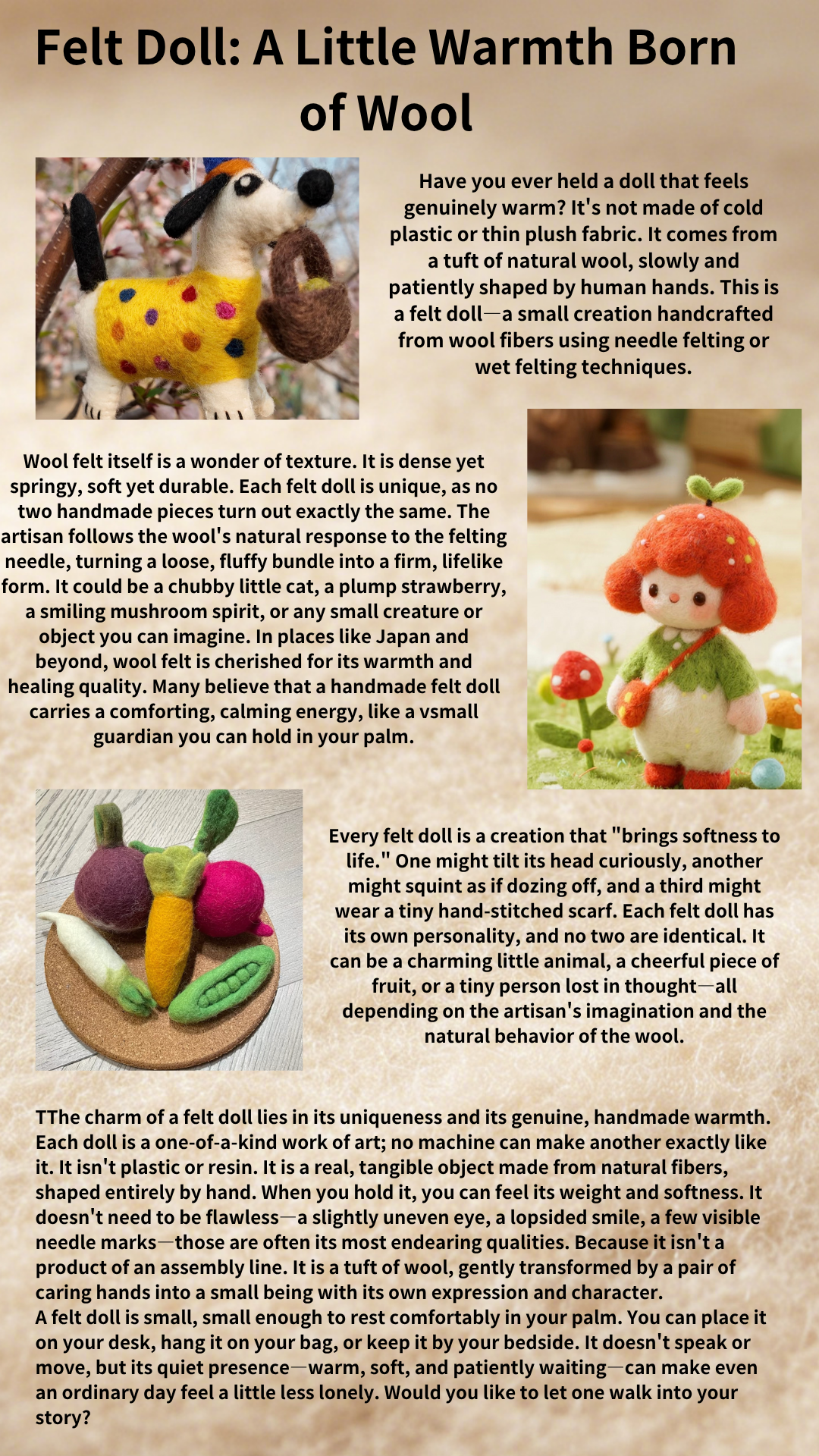 Wool felt itself is a wonder of texture. It is dense yet springy, soft yet durable. Each felt doll is unique, as no two handmade pieces turn out exactly the same. The artisan follows the wool's natural response to the felting needle, turning a loose, fluffy bundle into a firm, lifelike form. It could be a chubby little cat, a plump strawberry, a smiling mushroom spirit, or any small creature or object you can imagine. In places like Japan and beyond, wool felt is cherished for its warmth and healing quality. Many believe that a handmade felt doll carries a comforting, calming energy, like a vsmall guardian you can hold in your palm.